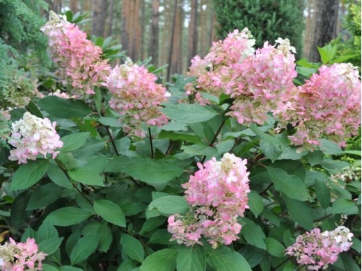Соцветия плотные, пышные, до 30 см длиной, пирамидальной формы. При роспуске белые, затем меняют свою окраску на пудрово- розовый цвет.