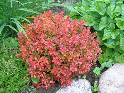 Барбарис Тунберга "Coral" - высокодекоративный низкорослый кустарник, отличается своей яркой коралловой окраской, хорошо впишется в любой ландшафтный дизайн. Его высаживают в миксбордерах, вдоль дорожки для имитации аллеи, в рокариях.Взрослый куст достигает высоты максимум 1 метр. Годовой прирост около 3-5 см. Листья мелкие, яйцевидные, почти округлые, кожистые, длиной до 1 см. Молодые листочки кораллово-красного цвета, позднее перерастают в розово-малиновые тона с красивой зелено-золотистой каймой. Глубокий цвет и окантовка сохраняется до поздней осени в течение всего сезона.