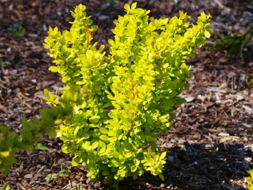Барбарис Тунберга "Golden Torch" один из красивейших сортов барбариса с чисто-желтыми листьями, используется в качестве живой изгороди, в рабатках, в миксбордерах, как солитер, в рокариях, для обозначения границ в альпийских горках.Высокий колонновидный кустарник до 1,2 м высотой и до 0,6 м в диаметре. Годовой прирост в высоту 10-15 см, в ширину 5-10 см. На побегах встречаются редкие шипы. Листья округлые, золотисто-желтые с весны до конца лета, к осени они становятся светло-красными-оранжевыми.