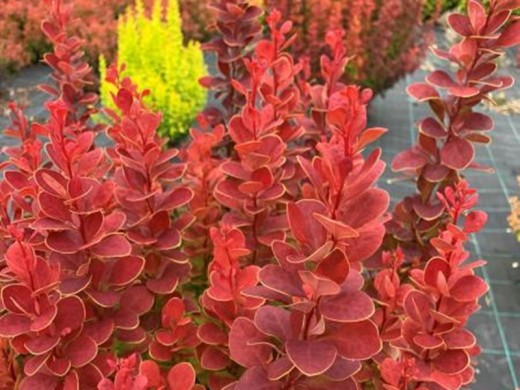 Барбарис Тунберга "Neon" – яркий компактный листопадный кустарник из серии Neon, который станет настоящим фейерверком красок в саду, идеально подходя для создания живых бордюров, узких изгородей, акцентов в миксбордерах, альпинариях или посадки в контейнерах на террасах и балконах. Этот польский сорт поражает интенсивной окраской листвы.Растение формирует плотный, прямостоячий куст с узкой, колонновидной или овальной кроной высотой 80–100 см и шириной 40–70 см. Побеги жесткие, вертикальные, густо покрыты шипами, что придает сорту дополнительную декоративность и защитные свойства.