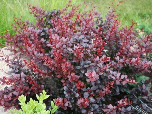 Барбарис Тунберга "Atropurpurea Nana" компактный декоративный кустарник. Этот сорт украсит собой ваш участок в качестве живой изгороди, в рабатках, вдоль дорожки для имитации аллеи, как солитер, в рокариях, для обозначения границ в альпийских горках.Крона плотная, округлая, высотой 0,5-0,6 м и шириной до 1 м. Годовой прирост: 10 см в высоту и 15 см. в ширину. Шипован простыми колючками до 0,8 см длиной. Декоративность барбарису придают красные листья, к осени оттенок меняется на карминно-коричневый с фиолетовым оттенком. Листья небольшие, продолговатой формы, узкие у основания, округлые сверху. Длительное время не опадают.