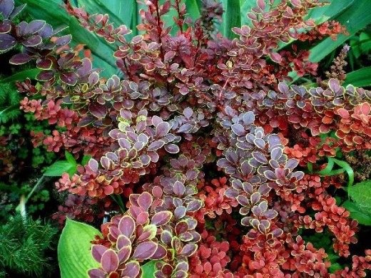 Барбарис Тунберга "Golden Ring" - отличительная особенность этого декоративного кустарника - пурпурные листья с желтой каймой. Сорт хорош в качестве живой изгороди, в рабатках, вдоль дорожки для имитации аллеи и как солитер.Взрослый куст вырастает высотой и шириной до 2 м с пышной, раскидистой кроной. Годовой прирост около 15-20 см. Листья овальные, небольших размеров, к осени приобретают багряные оттенки, с ярко выраженной, золотистого цвета каймой.