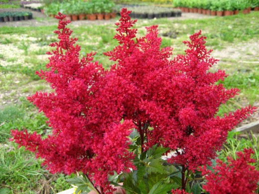 Астильба «Red Sentinel» – считается лучшим красным голландским сортом.Представляет собой Листья – красно-бурые. С наступлением лета цвет меняется на матово-зеленый. Соцветия ярко-красного окраса, ромбические, не слишком плотные, но все вместе они образуют пышный и не разваливающийся куст. Длина соцветий иногда доходит до 30-40 см. Используется в миксбордерах, рабатках, бордюрах, в тенистых альпийских горках, клумбах вокруг стволов деревьев, крупных контейнерах. Посаженная большими группами, она радует своим интенсивным красным полем цветов во время цветения.