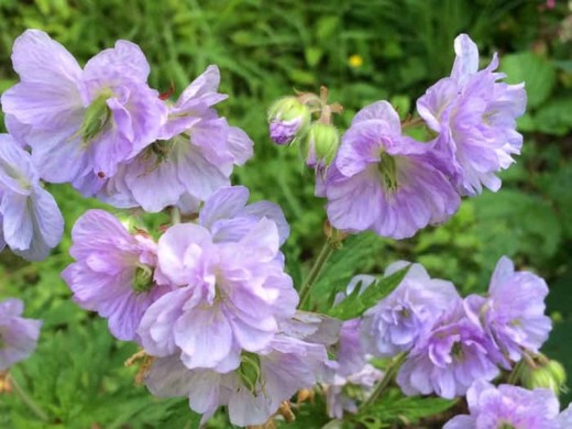 Цветки махровые, диаметром до 4 см, сиренево-голубые или сиренево-розовые, становятся немного светлее по мере отцветания. Цветки собраны в рыхлые соцветия. Цветение очень обильное и двукратное — первая, основная волна приходится на май-июнь, а повторная происходит в конце августа-сентябре. Растение привлекает пчёл и бабочек, устойчиво к болезням и слизням.