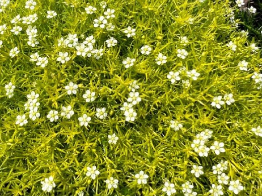Листья мелкие, шиловидные, ярко-лаймового или светло-зелёного цвета, густо покрывают тонкие стебли, создавая плотный и пушистый ковёр, напоминающий мох. С июня по август растение украшают крошечные белые цветки диаметром около 0.5 см, одиночные или в небольших группах, которые добавляют ему воздушности и изящества.