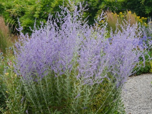 Перовския "Blue Spire" цветёт обильно и продолжительно, а после цветения её сухие побеги и соцветия сохраняют декоративность, добавляя саду текстуру до поздней осени.