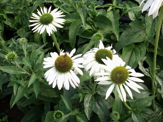 Эхинацея пурпурная "Alba" Представляет собой травянистый многолетник. Эхинацею- используют для создания рабаток, миксбордеров, альпинариев и ярких клумб. Подойдёт для среза и создание букетов.Высота растения достигает 1м. Ширина 60см. Цветки крупные (диаметром 12см) , немного свисающие белые лепестки, середина соцветия выпуклая, оранжево-коричневая и немного колючая. Цветет обильно с июля по сентябрь. Хорошо смотрится в посадке с низкорослыми многолетними растениями. При посадки группами или среди газона.