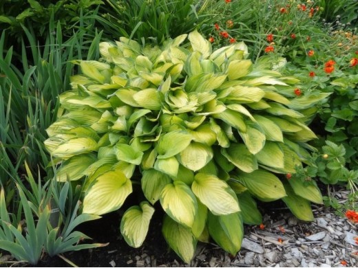 Хоста Форчуна "Gold Standard" идеальна для посадки вокруг деревьев, для альпийских горок, для создания бордюров, и посадки вокруг водоемовМноголетнее кустарниковое растение. Имеет куполовидную, раскидистую форму. Высота 50-70см и ширина 90-120см. Стебли плотные, поэтому выдерживают вес листьев и не нуждаются в подвязки или дополнительной опоре. Листья хосты прикорневые. Они имеют сердцевидную форму с заостренными кончиками. В длину достигают 12х14 см. Цвет листьев изменяется за сезон. В весенний период они светло-зеленые. В дальнейшем листья становятся желто-золотистыми. При обильном солнечном освещении в летний сезон они могут выгорать. Тогда листья хосты становятся кремово-белыми с каймой темно-зеленого цвета по бокам. Цветки воронковидные или воронковидно-колокольчатые, белые, собраны в кистевидное, часто однобокое соцветие. Лучше всего растет в полутени. Хосты любят влагу, поэтому растение следует поливать регулярно, но не допускать переувлажнения.