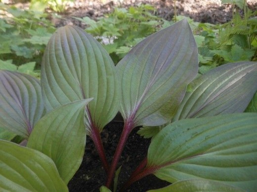 Хоста гибридная "First Blush" Среднего размера хоста, разрастается в ширину до 60 см. Листья размером 20х12 см, высотой 35 см, зелёные с красными черешками и узким красным краем. Весной листья между прожилками начинают краснеть от кончика листа вниз к основанию и остаются красными до наступления жары +30ºС, в жару красный цвет исчезает. Цветки лавандовые. Цветение в августе. br> Хоста гибридная "First Blush"-срок посадки конец апреля в места, где тень и полутень. Хосты высаживают в расстоянии в 50см друг от друга. Необходим постоянный полив и подкормка. Почва хорошо дренированная и влажная, кислотность может быть любой.