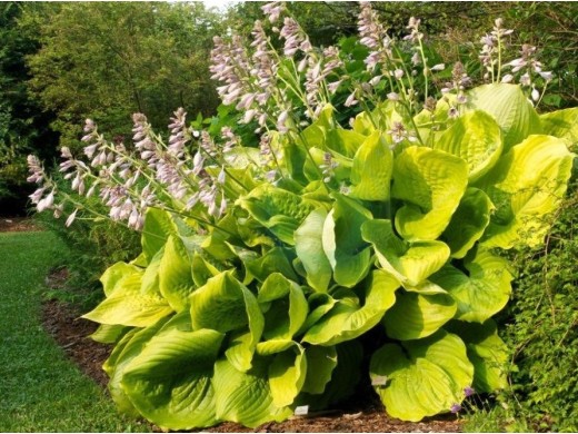 Хоста гибридная "Sum and Substance" считается гигантом среди хост, даже при посадке в самые темные и отдаленные участки вашего сада она будет чувствовать себя королевой.Хоста гибридная "Sum and Substance"- одна из самых крупных хост желтого цвета из имеющихся в настоящее время. В возрасте 6-7 лет достигает зрелого возраста, высота растения достигает 100см и ширина 150-180см. Листья у сорта Sum and Substance умеренно гофрированные, с отличной текстурой, с глубокими лопастями, форма листа выгнута чашечкой, причем может быть выгнута и вверх, и вниз. На конце листа имеется длинный кончик. Окраска не меняется в течение всего сезона Листья очень плотные, из-за чего плохо повреждаются улитками и слизнями. Размер листа 40-45см. Цветение начинается с середины июля, длится 2-3 недели. Соцветия расположены на высоких цветоносах. Цветы бледно-лавандовые, крупные 8см, с насыщенным, сладким ароматом лилий