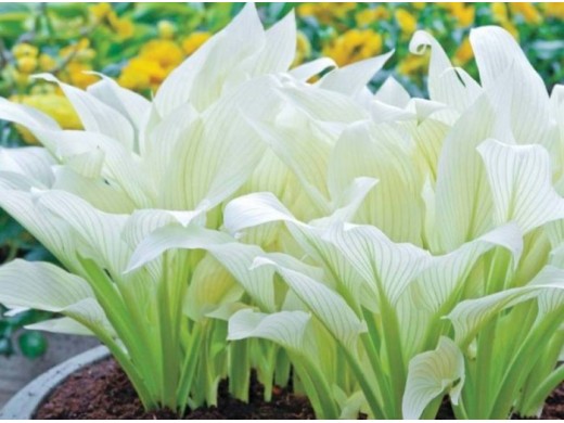 Хоста гибридная "White Feather" это нежная и очень необычная белая хоста. Подойдет для создания раноцветущих полутеневых клумб и композиций. Привлекает к себе внимание, благодаря её необычной расцветки.Самый эффектный сорт хост. Кусты достигают в высоту 50 см а в ширину 65см. Растение раскидистое. Листья (8х15см) имеют овальную форму с небольшим заострением на конце . Молодые листья нежного сливочно-белого цвета. В дальнейшем, по мере роста, они покрываются ярко-зелеными полосами. Цветоносы высокие, цветы белого оттенка с легким ароматом. Сорт наиболее тенелюбивый. Хосты любят влагу, поэтому растение следует поливать регулярно, но не допускать переувлажнения. На солнце выращивать декоративный куст не следует. Из-за прямого воздействия лучей в летний сезон листья выгорают и быстро пересыхают.