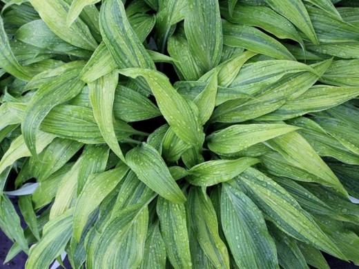 Листья узкие, копьевидные или ланцетные, серо-зелёные, с неравномерными жёлтыми прожилками, полосами и пятнами; обратная сторона листьев серебристо-металлическая, что усиливает декоративность; поверхность гладкая, сохраняют декоративность круглый год, особенно эффектны весной и осенью.