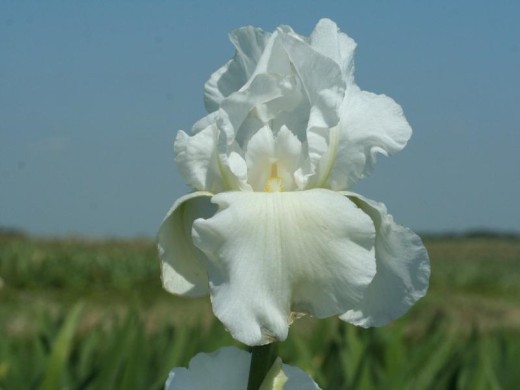 Ирисы германские – это группа корневищных многолетних растений, известных своими крупными, эффектными цветками и разнообразием окрасок. Они являются одними из самых популярных садовых ирисов и отличаются относительной неприхотливостью. Наличие бородки на фолах – характерная черта германских ирисов. Она служит для привлечения насекомых-опылителей и придает цветку дополнительную декоративность. Подходит для групповых посадок, для цветников и посадок вблизи от водоема.Высокорослый сорт гибридного происхождения. Цветонос крепкий, достигает 70 см в высоту и выше. Он образует от 1 до 7 цветков с довольно широкими, сильно гофрированными лепестками. Цветки чисто белого цвета с шелковистым блеском, форма цветка крупная и изящная, с волнистыми краями. Листья линейные, мечевидные, жесткие.