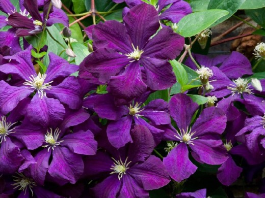 Главная особенность - исключительно обильное и продолжительное цветение на побегах текущего года. Цветение наступает в июне и продолжается без перерыва до сентября . Цветки распускаются по всей длине побега, создавая эффект цветущего водопада. Соцветия - одиночные, раскрытые, звездчатой формы, диаметром от 6 до 15 см в зависимости от условий произрастания и ухода . Обычно цветок состоит из 4-6 широких, бархатистых, слегка волнистых или морщинистых чашелистиков насыщенного тёмно-фиолетового или пурпурно-фиолетового цвета. В центре цветка расположены контрастные тычинки кремового или жёлтого цвета с золотистой пыльцой . Лучше всего смотрится на светлом фоне .