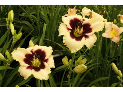 Сорт обладает эффектным контрастом цветка и обильным цветением. Повторно цветущий сорт. Цветок имеет светло-кремовые лепестки, в центре темно-пурпурный глаз и зеленое горло. Тип вегетации — полувечнозеленый. Мечевидно-изогнутые, зеленые листья образуют плотные кусты. Листва декоративна в течение всего периода вегетации. Посаженные культуры ежедневно поливают в течение 7 дней. Взрослые лилейники увлажнят только при длительных засухах, причем исключительно теплой водой, которую льют под корень. Лилейник один из самых малотребовательных многолетников. Использование: солитерные посадки среди газона, около водоема, групповые посадки с различными многолетниками. Эффектны лилейники различных сортов в одной группе, подобранные по высоте и срокам цветения, подходят для срезки.