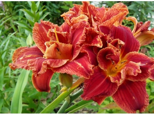 Лилейники идеальны для использования в различных ландшафтных композициях. Листья узкие, создают красивый фон для эффектных цветков. Прекрасно смотрится как в одиночных посадках, так и в групповых композициях, добавляя яркий акцент в любой сад.Махровый, бархатный цветок кирпично-красного цвета. Светло зеленое горло и тонкая золотистая кайма. высота 65см, диаметр цветка 15см. Срок цветения средний, повторно цветущий.