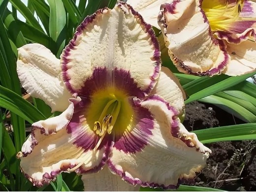 Лилейники идеальны для использования в различных ландшафтных композициях. Листья узкие, создают красивый фон для эффектных цветков. Прекрасно смотрится как в одиночных посадках, так и в групповых композициях, добавляя яркий акцент в любой сад.Цветки большие, диаметром 18 см, цвета слоновой кости с глазком цвета бургунди и жёлто-зеленовытым горлом. Кайма цвета бургунди с золотом. Цветение в июле. Высота 70 см.