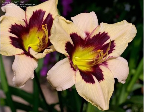 Повторно цветущий сорт. Высота растения 70 см. На кремово-белой поверхности лепестков контрастно выделяются широкие пурпурные штрихи и окантовка. Цветы крупные, диаметром около 15 см. Цветки по форме похожи на цветки лилий, крупные, воронковидные, шести раздельные, с небольшой трубкой, собраны по 2-10 в раскидистые соцветия. Мечевидно-изогнутые, зеленые листья образуют плотные кусты. Листва декоративна в течение всего периода вегетации. Продолжительность цветения каждого куста около 3 недель. Посаженные культуры ежедневно поливают в течение 7 дней. Взрослые лилейники увлажнят только при длительных засухах, причем исключительно теплой водой, которую льют под корень. Лилейник один из самых малотребовательных многолетников. Использование: солитерные посадки среди газона, около водоема, групповые посадки с различными многолетниками. Эффектны лилейники различных сортов в одной группе, подобранные по высоте и срокам цветения, подходят для срезки.
