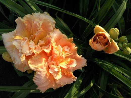 Высота куста 65 см. Цветет многолетник в июне, возможно повторное цветение в августе-сентябре. Цветы махровые, насыщенного темно-лососевого цвета с желтым горлом и рельефной желтой полоской по центру лепестков.