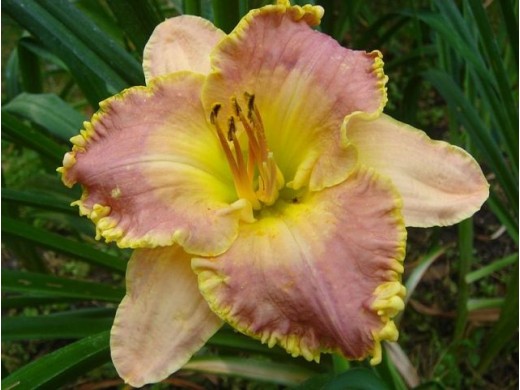 Окраска лилейника может изменяться от светло- до тёмно-малинового, в зависимости от условий выращивания. Края жёлто-зелёные, гофрированные, горло зелёное. Лепестки широкие, наружные сильно отогнуты назад. Высота лилейника 60 см, цветок 15 см. Отличные ростовые качества, высокая зимостойкость, и сорт очень хорошо размножается. Мечевидно-изогнутые, зеленые листья образуют плотные кусты. Листва декоративна в течение всего периода вегетации. Продолжительность цветения каждого куста около 3 недель. Посаженные культуры ежедневно поливают в течение 7 дней. Взрослые лилейники увлажнят только при длительных засухах, причем исключительно теплой водой, которую льют под корень. Лилейник один из самых малотребовательных многолетников. Использование: солитерные посадки среди газона, около водоема, групповые посадки с различными многолетниками. Эффектны лилейники различных сортов в одной группе, подобранные по высоте и срокам цветения, подходят для срезки.