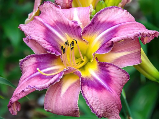Цветки крупные (диаметром 15–17 см), гофрированные по краям, лавандово-розовые с голубоватым глазком и такой же каймой, ярким зелёным горлом; форма округлая, с волнистыми лепестками .Цветение очень обильное, приходится на середину лета (июль–август); аромат приятный, сладковатый.
