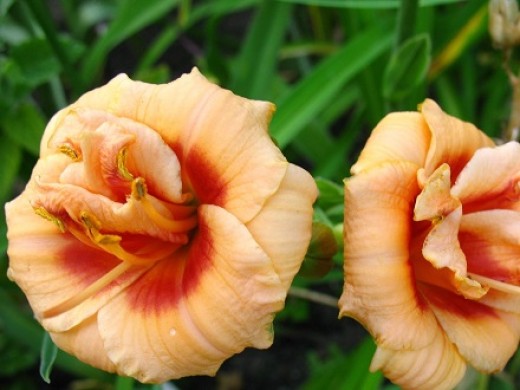 Цветки огромные, махровые, сливочно-розовые с пурпурным глазом и желтым горлом. Обильнейшее цветение. Высота 60см, диаметр цветка 16см. Период цветения июль-август. Повторно цветущий.