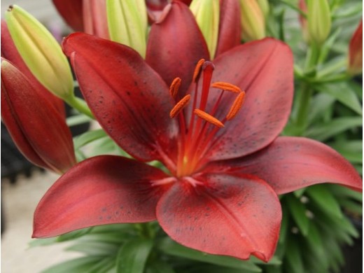 Азиатский низкорослый гибрид. Обычно достигает высоту 40 см. Цветки большие, диаметром около 15 см,тёмно-красные, каждый лепесток густо усеян чёрными крапинками, стебли удерживают до 10 бутов. Аромат: средний, нежный, сладкий, с нотками ванили и цитрусовых. Цветёт в начале-середине лета (июнь-июль).