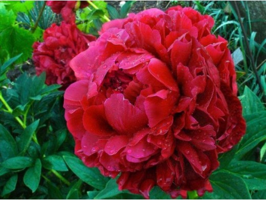 Межвидовый гибрид. Цветок махровый с розовидным центром, гранатово-темно-красный, блестящий, плотного сложения. Срок цветения: ранне-средний. Аромат легкий. Высота 90см, размер цветка 20см. Зимостойкий (-40 С ).Характеристики: