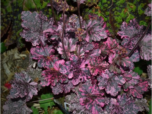 Необычный пятнистый сорт. Данный сорт имеет листву темно бордового цвета с бледно-розовыми пятнами. Растение высотой 25 см и диаметром до 40 см. В конце весны на высоких цветоносах появляются маленькие, розоватые цветочки. Использование: миксбордеры, композиции, рокарии, бордюры.