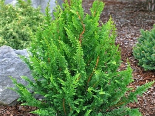 Кипарисовик тупой «Teddy Bear» - популярный, карликовый, хвойный кустарник, ценящийся за свою чрезвычайно плотную, подушковидную форму и необычайно мягкую, пушистую хвою, напоминающую медвежью шкурку. Благодаря миниатюрным размерам, декоративной текстуре и изящному виду он стал излюбленным акцентным растением для альпинариев, японских садов, вересковых композиций и контейнерного озеленения.Форма кроны очень плотная, густая, симметричная, подушковидная или ширококоническая, с плавными, округлыми очертаниями. Годовой прирост составляет 2-5 см. Максимальные размеры во взрослом состоянии – около 0.9-1.2 м в высоту и до 0.8-1.0 м в диаметре. Хвоя чешуевидная, мелкая, мягкая и нежная на ощупь, насыщенного тёмно-зелёного цвета с голубоватым отливом. Окрас сохраняется в течение всего года. Шишки очень редкие, мелкие, округлые, около 1 см в диаметре, оранжево-коричневые.