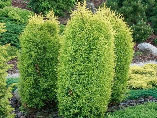 Форма кроны очень плотная, густая, симметричная, узкоконическая или колонновидная. Растет медленно, годовой прирост составляет 10-15 см в высоту и 5-8 см в ширину. Максимальные размеры во взрослом состоянии –- около 2-2.5 м в высоту и до 0.5-0.8 м в диаметре. Хвоя игольчатая, колючая, но не грубая. Её главная особенность - яркая золотисто-жёлтая окраска молодых приростов, которая сохраняется в течение всего теплого сезона, а к зиме приобретает красивый бронзово-жёлтый или золотисто-коричневый оттенок. Шишки мелкие, округлые, сизо-голубые, созревающие на второй год.