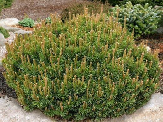 Сосна горная «Mughus» - популярный, карликовый, хвойный кустарник, ценящийся за свою плотную, широкораскидистую форму и насыщенную темно-зеленую окраску хвои. Благодаря высокой выносливости, неприхотливости и способности расти в сложных условиях он стал классическим выбором для укрепления склонов, создания массивов, альпинариев и садов в природном стиле.Форма кроны очень плотная, густая, раскидистая, подушковидная. Ветви растут горизонтально, с приподнимающимися концами, образуя плотный, симметричный куст. Растет медленно, годовой прирост составляет 5-10 см. Максимальные размеры во взрослом состоянии - около 1.5-2.5 м в высоту и до 2-3 м в диаметре. Хвоя игольчатая, жесткая, собрана в пучки по две хвоинки, длиной 3-5 см, темно-зеленого цвета. Зимой может приобретать легкий желтоватый оттенок. Шишки мелкие, округлые или яйцевидные, коричневые, появляются редко.