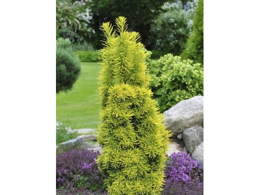 Тис ягодный «David» - популярный, медленнорастущий хвойный кустарник, ценящийся за свою строгую колонновидную форму и эффектную декоративную листву с яркой желтой каймой. Благодаря архитектурной форме, высокой теневыносливости и способности отлично переносить стрижку он стал классическим выбором для создания невысоких формальных изгородей, а также для акцентов в тенистых уголках сада.Форма кроны очень плотная, густая, симметричная, колонновидная или пирамидальная. Побеги прямые, вертикальные, густо покрытые хвоей, образуют чёткий, компактный силуэт. Растет медленно, годовой прирост составляет 10-15 см. Максимальные размеры во взрослом состоянии - около 1.5-2 м в высоту и до 0.6-0.8 м в диаметре. Хвоя игольчатая, плоская, блестящая, длиной 2-3 см. Её главная особенность - золотисто-жёлтый цвет края хвоинок, в то время как их центр остаётся тёмно-зелёным. Такой двухцветный эффект создаёт общее впечатление золотистой кроны. Плоды (семена с присемянником) ярко-красные, мясистые, эффектно контрастируют с хвоей. Важно помнить: все части растения ядовиты.