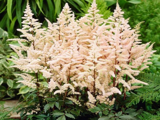 Астильба Арендса «Bumalda» - компактный и очень изящный сорт астильбы, ценящийся за воздушные, пышные соцветия кремово-белого цвета с лёгким розовым оттенком. Благодаря раннему и обильному цветению, аккуратной форме куста и отличной теневыносливости этот сорт идеально подходит для переднего плана тенистых цветников, бордюров, рокариев, берегов водоёмов и природных композиций в полутени.Форма куста - плотная, компактная, мочковато-кустовая, с сильным ветвистым корневищем. Высота во время цветения обычно составляет 40–60 см (иногда до 70–75 см), ширина куста около 40–60 см. Листья сложные, глубоко рассечённые, блестящие, тёмно-зелёные с характерным бронзово-красноватым или медным оттенком (особенно молодые и осенью), что придаёт растению декоративность даже вне периода цветения.