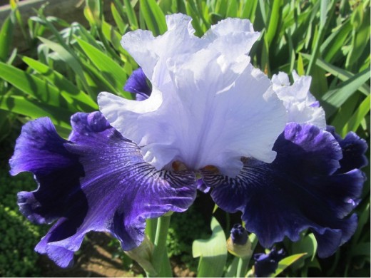 Цветки совершенной формы, гофрированные. Стандарты и стайлы голубовато-белые. Фолы тёмно-сине-фиолетовые с тонкой белой каймой. Бородка жёлтая. Цветение обильное