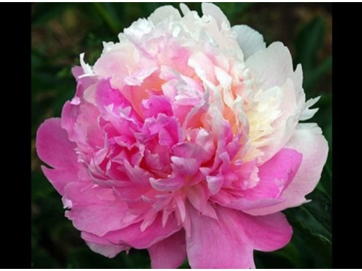 Цветки махровые, полушаровидные, крупные, достигают диаметра до 18 см. Окрас цветов: розово-кремовый, белый с розоватыми вкраплениями или один цветок двойного окраса: одна половина белая, другая — розовая. Цветение обильное, приходится на май–июнь, сопровождается лёгким приятным ароматом.