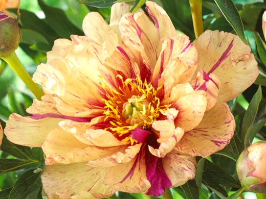 Пион Ито-гибридный "Lollipop" – яркий и необычайно декоративный травянистый многолетник с экзотическим цветением, который станет настоящей изюминкой сада, идеально подходя для создания ярких акцентов в миксбордерах, групповых посадок, солитерных композиций или срезки в букеты. Этот знаменитый сорт ценится за крупные полумахровые – махровые цветки на жёлтом фоне с хаотичными полосами, мазками и брызгами яркого малиново-пурпурного или красного цвета – каждый цветок уникален, словно конфета-леденец, и никогда не повторяется в точности, что делает растение по-настоящему коллекционным.Растение формирует крепкий, компактный куст высотой 70–90 см и шириной около 70–90 см. Побеги прямые, прочные, хорошо ветвятся, надёжно удерживают тяжёлые цветки без подвязки.