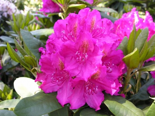 Рододендрон гибридный "Pearce's American Beauty" - вечнозеленый кустарник с впечатляющим ярким и обильным цветением станет украшением вашего сада. Прекрасный выбор для тех, кто хочет добавить цветовой акцент у себя в саду, украсить зону около водоема или создать японский уголок на приусадебном участке.Сорт относится к быстрорастущим, взрослый куст к 10-ти годам может вырасти до 1,8-2 м в высоту и ширину. Побеги мощные, толстые создают округлую, слегка приплюснутую крону. Листья большие, вытянутые, до 16 см в длину, плотные, темно-зеленые. Годовой прирост 12 см.