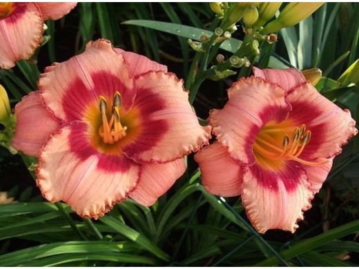 Травянистый корневищный многолетник. Повторно цветущий сорт. Цветок землянично-розовый перелив с розово-красным глазом и такого же цвета узкой каймой на гофрированных внутренних лепестках. Золотисто-зеленое горло. Полувечнозеленый. Мечевидно-изогнутые, зеленые листья образуют плотные кусты. Листва декоративна в течение всего периода вегетации. Посаженные культуры ежедневно поливают в течение 7 дней. Взрослые лилейники увлажнят только при длительных засухах, причем исключительно теплой водой, которую льют под корень. Лилейник один из самых малотребовательных многолетников. Использование: солитерные посадки среди газона, около водоема, групповые посадки с различными многолетниками. Эффектны лилейники различных сортов в одной группе, подобранные по высоте и срокам цветения, подходят для срезки.
