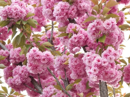 Сакура "Канзан" это декоративное дерево вишни с маленькими кисло-горькими плодами, размером в горошину.