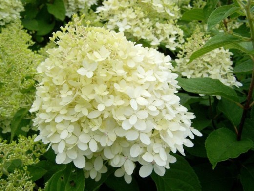 Широкопирамидальные соцветия-метелки до 30см, в начале цветения и в тени преобладает цвет лайма, на солнце - чисто-белые, в конце цветения розовеют.