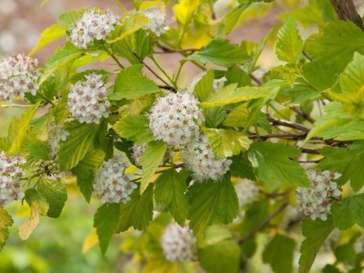 Цветение в начале июня белыми-розовыми цветками, собранными в щитковидные соцветия, которые эффектно смотрятся на фоне золотистой листвы.