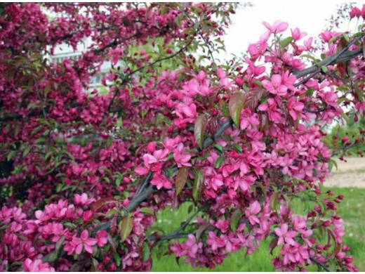 Яблоня декоративная "Ola"- быстрорастущее, скороплодное дерево. "Ola" особенна хороша во время цветения, когда крона дерева превращается в большое розовое облако. Подходит для озеленения садов и парков.Взрослое дерево высотой до 5 метров. Крона округлая, ажурная, в диаметре может доходить до 7 м. Листья при распускании бронзово-красные, затем становятся бронзово-зелеными.