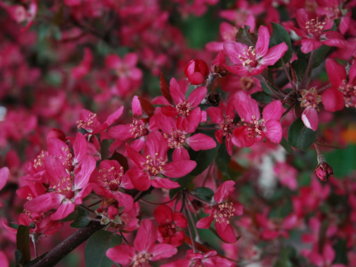 Яблоня декоративная "Royalty" - декоративный гибрид среднеазиатской яблони Недзвецкого, с багряными цветками, похожими на цветки японской сакуры. Подходит для озеленения садов и парков.Дерево достаточно высокорослое. К 10 годам она достигает 3-4 метров, максимальная высота дерева 5-6 метров. Листья красно-фиолетового цвета, длиной до 12 см, осенью становятся бронзово-красными.