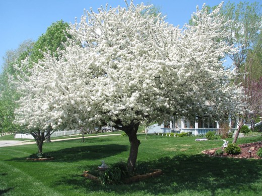 Яблоня декоративная "Эверест"- красивоцветущее дерево с широкой ажурной кроной. Подходит для озеленения садов и парков, для формирования шпалерной живописной изгороди.Взрослое дерево высотой до 4–6 м, с раскидистой широкопирамидальной кроной до 3–5 м диаметром. Листья тёмно-зелёные, на красных черешках.