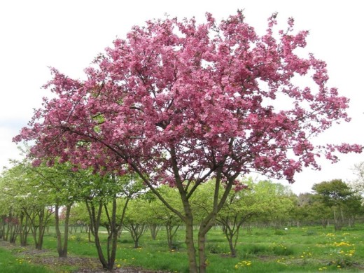 Яблоня декоративная "Rudolph" особенна хороша весной, во время цветения, когда крона дерева превращается в большое розовое облако. Подходит для озеленения садов и парков.