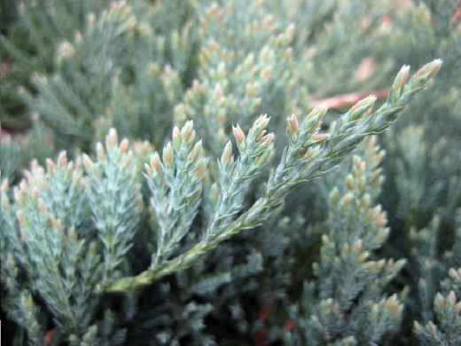 Можжевельник горизонтальный «Blue Chip» – популярный, стелющийся, хвойный кустарник, ценящийся за свою исключительно плотную, ковровую форму и эффектную серебристо-голубую окраску хвои. Благодаря высокой декоративности, неприхотливости и способности образовывать плотный вечнозеленый покров он широко используется для декорирования склонов, альпинариев, рокариев и создания «хвойных газонов».Форма кроны очень плотная, компактная, подушковидная, с горизонтально стелющимися и равномерно ветвящимися побегами. Растет умеренно, годовой прирост составляет 5-8 см в высоту и 10-15 см в ширину. Максимальные размеры во взрослом состоянии – около 0.2-0.3 м в высоту и до 1.5 м в диаметре. Хвоя преимущественно чешуевидная, мелкая, мягкая. Её главная особенность – стабильный голубовато-стальной или серебристо-сизый цвет в течение всего сезона, который зимой часто приобретает легкий сиреневый или фиолетовый оттенок. Шишки мелкие, шаровидные, синевато-белые.