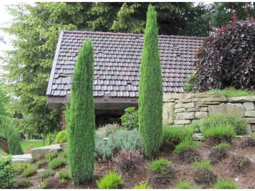 Можжевельник обыкновенный «Sentinel» - популярный, хвойный кустарник, ценящийся за свой строгий вертикальный силуэт и густую, насыщенно-зеленую хвою. Благодаря своей архитектурной форме и компактности он стал излюбленным вертикальным акцентом для небольших садов, альпинариев, вересковых композиций, а также для создания узких живых изгородей и оформления парадных зон.Форма кроны очень плотная, густая, симметричная, узкоконическая. Побеги растут вертикально вверх, плотно прилегая друг к другу, образуя четкий, стройный силуэт, напоминающий зеленый шпиль. Годовой прирост составляет 10-15 см. Максимальные размеры во взрослом состоянии - около 3-4 м в высоту и всего 0.4-0.6 м в диаметре. Хвоя игольчатая, колючая, короткая, яркого зеленого цвета с легким сизоватым оттенком. Зимой хвоя может приобретать легкий буроватый или бронзовый оттенок. Шишки шаровидные, мелкие, в незрелом виде зеленые, при созревании становятся сине-черными с сизым налетом.