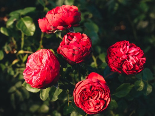 Цветки густомахровые, крупные, диаметром 6-8 см. Уникальная форма меняется от идеально шаровидного, тугого бутона до глубокой чаши при полном роспуске. Окрас — насыщенный, ярко-красный. Цветки могут располагаться по одному или в небольших кистях по 3–5 штук на стебле. Аромат слабый или практически отсутствует.
