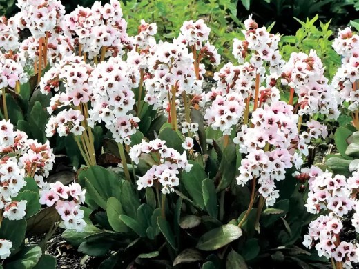 Листья крупные, округлые или овальные, кожистые, темно-зеленые с глянцевым блеском, длиной 15-25 см; осенью и зимой часто приобретают бронзово-красные или бордовые оттенки, добавляя саду осенне-зимнего шарма.